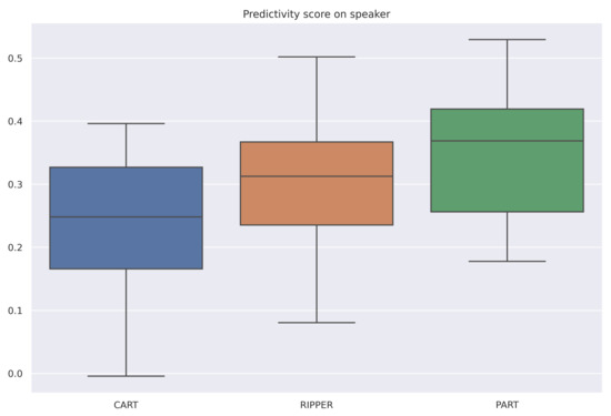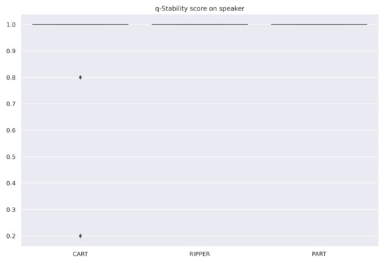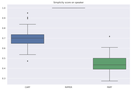 The averaged scores are summarized in Table 6. All selected algorithms have the same accuracy for all datasets. However, RIPPER and PART are both very stable algorithms, and RIPPER is the simplest of the three algorithms. Therefore, for these datasets and among these three algorithms, RIPPER is the algorithm that is most interpretable according to our measure (6). Figure 4, Figure 5 and Figure 6 are the box-plots of the predictivity scores, q-stability scores and simplicity scores, respectively, of each algorithms for the dataset Speaker.