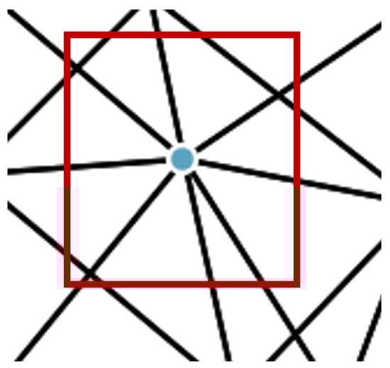 When physically building mass-spring systems, as introduced in Section 2.2, we have to deal with tolerances due to imperfections in the creation process. Therefore, the initial position of masses diverted from the positions was assumed in the simulation; this is visualized in Figure 4. As a first step to deal with this problem, we can replace each component of the location vector p of a mass, with an interval or ball of the form , representing the possible positions of the mass (red rectangle in Figure 4). We call this a hyperrectangle or, in abstract interpretation terminology, a box. This abstraction was then directly used in the simulation using ball arithmetic [,]. Instead of concrete numbers for our states , we then got state tuples of the form , which we collected in the matrices and , respectively. Senn and Kumazawa [] proposed to use the additional information as constraints for the linear regression and use a splitting conic solver [] to solve:
