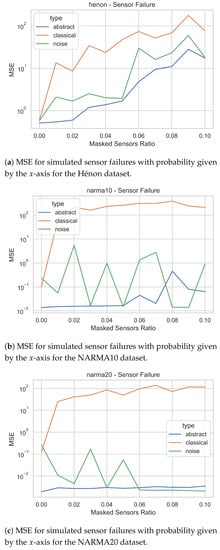 The average MSE with standard deviations for simulated sensor failures for the datasets (a) Hénon, (b) NARMA10 and (c) NARMA20.