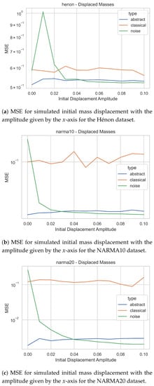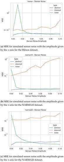 For each experiment, we measured the mean squared error (MSE), given by Equation (16), between the generated outputs by the system and the values y in test sets. As can be seen in Figure 8, Figure 9, Figure 10 and Figure 11, our proposed approach scores better regarding the MSE compared to the classical approach in all experiments. Compared to the training regime with noise, at high enough noise levels, it takes over or performs equally to our proposed training regime. Exact numbers can be found in the Appendix A in Table A1, Table A2, Table A3 and Table A4.