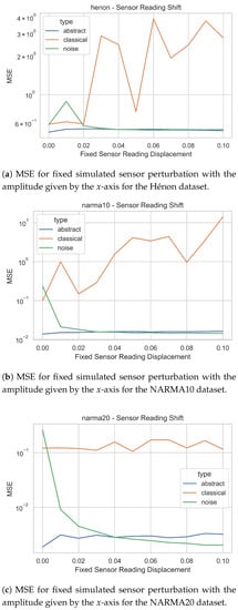 The average MSE with standard deviations for fixed simulated sensor reading displacements for the datasets (a) Hénon, (b) NARMA10 and (c) NARMA20.
