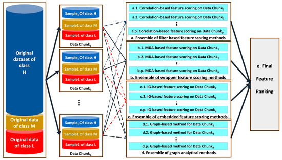 Each step from a to d performs one module of feature selection for each data chunki for 1 ≤ i ≤ p. Correlation-based feature scoring is performed in the substeps of a.1–a.p. Wrappers with the feature ranking based on mean decrease accuracy (MDA) are applied on data chunks in the substeps of b.1–b.p. For this purpose, the body classifiers of the wrapper feature selection methods are DT, LR and SVM. Step c uses embedded feature selection methods including GBC and RF for each data chunk separately and then combines their results in the corresponding ensemble method. Finally, a graph-based method for ranking the features is used in the substeps of d.1–d.p.