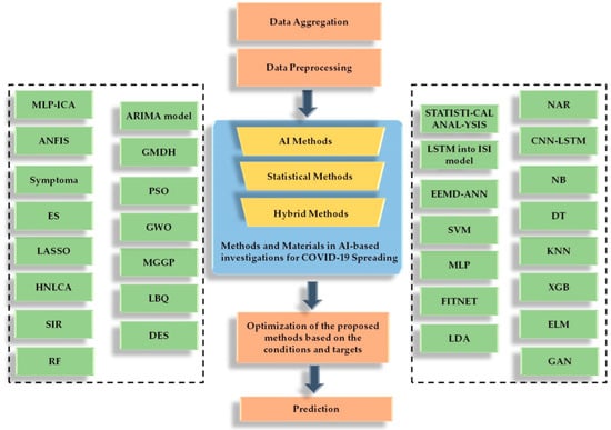 In addition, To investigate and prioritize parameters for consequences of the COVID-19 outbreak, differential evolution (DE) algorithm and ANN-based particle swarm optimization (PSO) algorithm were leveraged [74]. This research was focused on prioritizing and analyzing the role of certain environmental parameters. Scrutinizing four Italian cities in Italy, some main features, including climate parameters, such as relative humidity, daily average temperature, and urban parameters such as population density, were surveyed and applied as input an dataset while COVID-19 confirmed cases were considered as an output dataset [75]. The information about the recent research on the prediction of COVID-19 with the use of both statistical models and AI methods has been brought in Table 2.