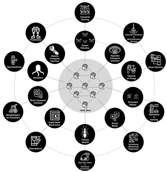 The prosthetics, enhancement, therapies, and machines to simplify our lives mentioned in the prior sections are on the verge of becoming mainstream in a few years. Some companies are already manufacturing drones with swarm intelligence that are used in agriculture and are EEG and sEMG-based. Several firms are using prosthetic limbs to rehabilitate war veterans who have been injured in the line of duty. DARPA is leading the efforts on this front. The FDA has approved implantable electronics for glucose monitoring and vital tracking for people suffering from critical illnesses. IoT devices have simplified our lives and have helped us save time to focus on other crucial aspects of our lives. Social networks have been a force for collectivism and organizing. There are excellent applications of the various technologies that will lead to the hive mind, and these applications are further explained in Figure 1 individually. These technologies individually might seem harmless, but things might get a little scary when they work in sync.