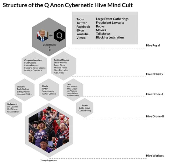 Puppet Masters of the QAnon ARG: In any ARG there are players who control the narrative from behind the scene. These are the people who create the path or rabbit hole through which the players traverse through the media transcending ARG. QAnon has quite a few puppet masters; one of the most famous ones is the Q Map creator named Jason Gelinas, a former employee of Citibank [134]. The other two known puppet-masters are Ron and Jim Watkins, who run the imageboard 8Kun [135]. Conspiracy theorists like James O’Keefe [136], Ali Alexander [137] have endorsed QAnon, and alt-right political leaders like Mike Flynn [138] and Roger Stone [139] have all pledged allegiance to QAnon. Crowdsourced intelligence points out Jim Watkins being Q, but other theorists say that there are several other figures who decide the narrative of the game who are in touch with Watkins based on email leaks [140,141]. The figure below gives a hierarchical view of the QAnon cult, their roles, and manipulation tools in the ARG. We are theorizing this as an insect hive/herd structure to better understand their functioning.