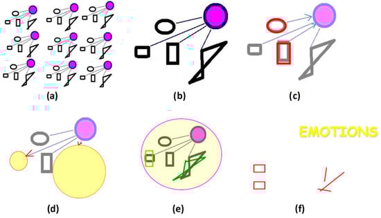 Basic structure and processes of the Ouroboros Model. (a) In a memory, there are many individual representations, i.e., (similar) schemata. (b) All schemata are comprised of specific combinations, i.e., linked bundles of features. (c) When an input becomes available, some initial features of a schema are activated. (d) As a consequence of the initial selection of a schema, the remaining linked features that make up that (partially) activated schema are biased and effectively searched for via spreading activation. (e) At regular intervals, all activations are balanced; a monitoring function (consumption analysis) checks the extent to which anticipations have been met, i.e., whether expected features in a schema are actually activated by the current input, and, conversely, to what extent occurring activations can be properly assigned, i.e., “consumed” by an existing schema. (f) Discrepancies/inconsistencies between expectations and actual occurrences are highlighted, and a feedback signal for the goodness of fit is produced, e.g., a measure of the degree to which a question has been answered satisfactorily. On a short time scale, features unaccounted for are included in the next iteration. Over longer time scales (and weighted by the importance of the involved features in the prevailing context), a more general signal is generated that can be understood as the “feeling“-component of an emotion [].