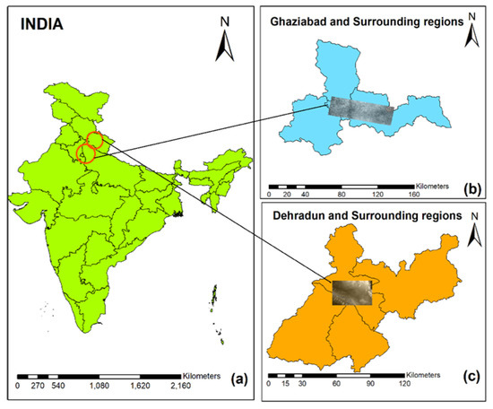 The study areas for implementing the process of fusion using a neural network-based approach are selected from diverse terrain in Indian states. The first study area is from Ghaziabad and the surrounding regions which is mainly a plain terrain region. The second study area is the hilly and undulating terrain of Dehradun and surrounding regions (Figure 1).