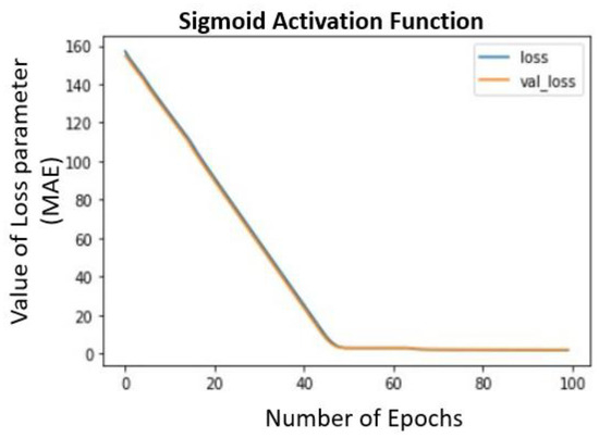 Training and Validation loss curves while training of the model using sigmoid activation function (x-axis represents the number of successive epochs and y-axis holds the value of loss parameter (MAE) for each epoch).