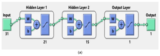 Generally, a Feed-Forward Multilayer Neural Network is useful for classification, regression, pattern recognition and prediction problems. A neuron of a layer is connected to the next successive layer neuron and each connection possesses a weight. The number of units in an input layer is exactly the number of input data applied to the network. A heuristic approach is applicable for obtaining an optimal architecture of the model by determining the required number of hidden layers, number of units in hidden layers, model parameters like the activation function, optimizer, number of layers, batch size, epochs and so on [33,34]; these are known as the hyperparameters, which are either selected heuristically or by hyperparameter tuning running several iterations to check the model performance. The output layer neurons are the number of classes or desired number of outputs. An ANN model can be implemented on several platforms like on TensorFlow using Keras library or with built-in applications of commercial software MATLAB NN-Toolbox (Neural Network). This study has employed both methods for designing ANN models in the study areas. MATLAB NN-Toolbox provides faster converging backpropagation algorithms other than the standard gradient descent backpropagation (traingd, traingdm). The other classes include algorithms with variable learning rates (traingda, traingdx), resilient backpropagation (trainrp), algorithms that use numerical optimization techniques like conjugate gradient (traincgf, traincgb, traincgp, trainscg), Quasi-Newton (trainbgf) and Levenberg Marquardt (trainlm) algorithms. Among the mentioned algorithms, the Levenberg Marquardt is most widely used as it converges faster by minimising the error gradient [35].