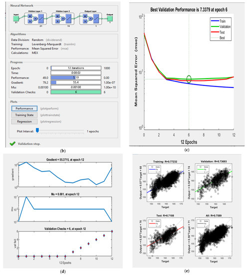 ANN Model in MATLAB for Ghaziabad and surrounding regions: (a) Model Architecture; (b) Model Parameters, (c) Model training performance, (d) Training state of Model and (e) Regression plots for target vs. output values.