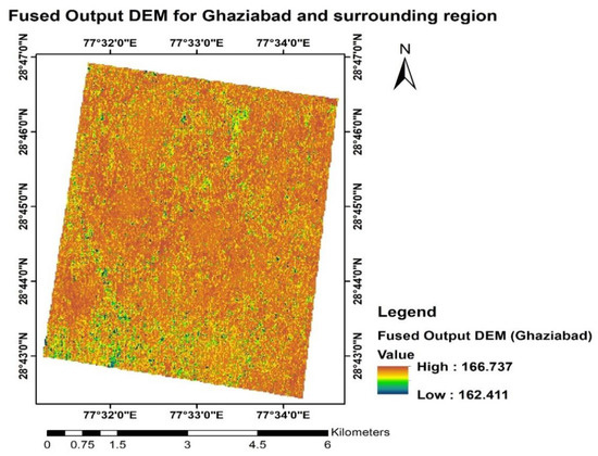 After the model is trained successfully, it is simulated on the test dataset of the area; these predictions, output and errors so produced, can be exported and saved. The output of DEM fusion from the models is assessed with accurate TanDEM-X 90 m DEM. The Fused Output DEM obtained from the ANN model in plain terrain of Ghaziabad and surrounding regions is represented in the map (Figure 5).
