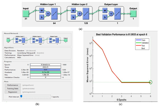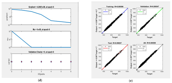 The architecture of the best fit model is shown in Figure 4a. The training process of the model can be visualised in the network parameters window (Figure 4b). The best performance during training is depicted in the performance plot which shows the training, validation, test and best performance curves in an epoch (depicted on the x-axis) vs. MSE (depicted on the y-axis) of the plot (Figure 4c). The best performance is achieved at the 6th epoch with an MSE of 7.33 m. The training state having gradient, momentum constant (Mu) and validation checks are shown in relation to the number of epochs given on the x-axis for each parameter plot (Figure 4d). Mu (μ or Momentum update) also known as the control or adaptation parameter used in the Levenberg Marquardt training algorithm while updating the parameters that approximate the inverse of the Hessian matrix [35]. The regression plot of training vs. output is also available to check the distribution of data (Figure 4e).