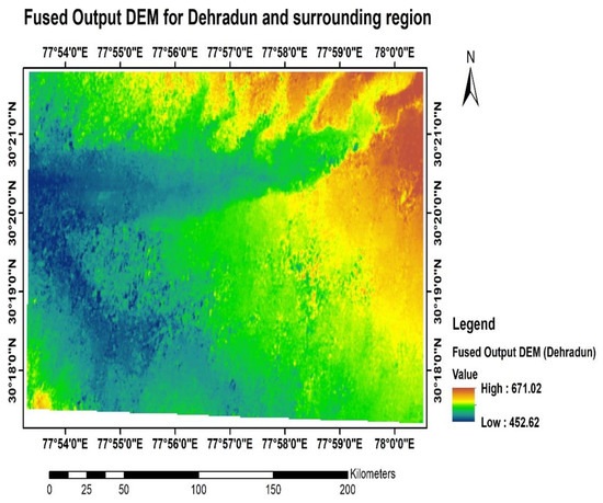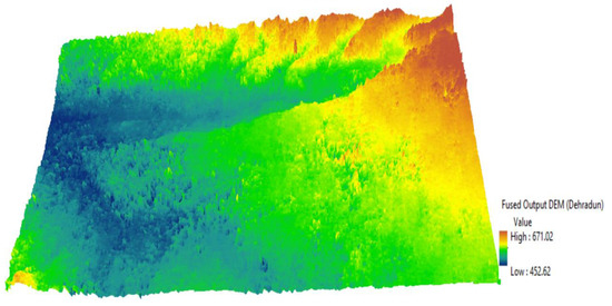 The predictions for fused DEMs are assessed with the TanDEM-X 90 m DEM to check the accuracy of the results. The fused output DEM from the Neural Networks predictive modelling is shown in the map (Figure 8). The 3D view for visualization of the terrain is depicted in Figure 9. The Root Mean Square Error (RMSE) is estimated to analyze the accuracy of fused DEMs in comparison to the multiple-input DEMs (Table 5).