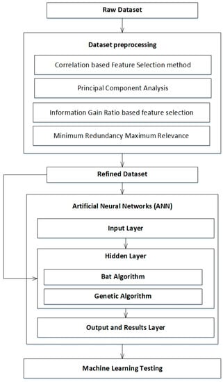 In the next phase, the proposed method used an artificial neural networks (ANN) for training the network, using a hidden layer of neurons. The last layer of the suggested strategy employs a hybrid of the genetic algorithms (GA) and Bat algorithms that were employed to calculate the cost of training and testing. Figure 1 represents the architecture of the proposed algorithm.