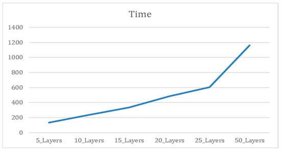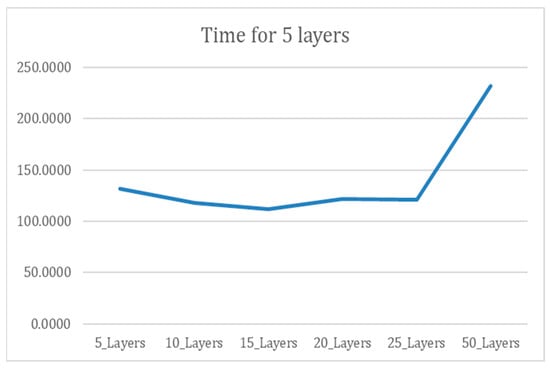 According to Figure 7, we can observe the preference for the third simulation run when using 15 hidden layers, where the average run time for every five layers needs 112.1408919 s. On the other hand, the worst case of the simulation run was for the first simulation run with only five layers, where the average run time reached 131.3239 s.
