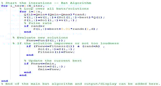 The suggested method’s computing complexity is determined by a variety of factors, including the number of pulse rates, iterations, and tasks. The Bat algorithm, which sorts universes on each iteration and has a complexity of O(n log(n)) in the best case and O(n 2) on the average and worst cases, are used for the sorting mechanism. Every variable in the universe is selected using a roulette wheel, and since our implementation of the roulette wheel selection mechanism has a complexity of O(log(n)), the suggested model scheduling algorithms have the following total complexity times: O (i ∗ n 2 + n ∗ t ∗ log(n)). Figure 9 shows simple code of the Bat algorithm.
