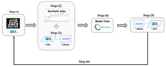 Schematic workflow for redesigning existing SBML models stored in databases into hybrid mechanistic/neural network models. Step 1: An SBML biologic model is extracted from a model database. Step 2: A synthetic time series dataset is generated to train the hybrid model. Step 3: A feedforward neural network (FFNN) is inserted in the mechanistic kinetic model and converted to the HMOD format using the SBML2HYB tool. Step 4: The hybrid mechanistic/FFNN model encoded in the HMOD format is trained by applying the deep learning approach (Section 2.1) and the synthetic dataset. Step 5: The trained hybrid model in the HMOD format is reconverted to SBML using the SBML2HYB tool. Step 6: The final trained hybrid model in the SBML format is uploaded in the model database and simulated comparatively to the original nonhybrid model.