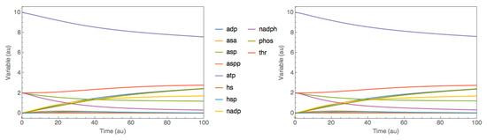 - Chassagnole, C.; Fell, D.A.; Rais, B.; Kudla, B.; Mazat, J.P. Control of the threonine-synthesis pathway in Escherichia coli: A theoretical and experimental approach. Biochem. J. 2001, 356, 433–444. [Google Scholar] [CrossRef] [PubMed]
