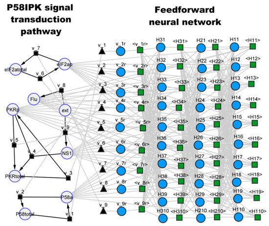 As in the previous case study, SBML hybrid models were created by combining FFNNs of different sizes (Table 3) with the original mechanistic model following the procedure of Figure 1. Figure 4 shows the hybrid model structure [5 × 10 × 10 × 10 × 9] (Table 3) using the SBML-visualizing cy3sbml tool [43]. The left side of Figure 4 represents the original mechanistic signal transduction network, whereas the right side represents the FFNN added to the mechanistic core. The FFNN has five inputs corresponding to the concentrations of the five dynamical species (Flu, NS1, P58a, PKRp and EIF2ap), three hidden layers (10 × 10 × 10) with hyperbolic tangent activation functions, and nine outputs corresponding to the kinetic rates (v_1r, v_2r, v_3r, v_4r, v_5r, v_6r, v_7r, v_8r, v_9r as they are named in the original SBML implementation). In this case study, the FFNNs in Table 3 completely replaced the kinetic laws of the original model, which were therefore deleted in the hybrid model structures. This network may be interpreted as a hybrid signal transduction pathway with a physical part composed of proteins and an artificial part composed of abstract neural network nodes.