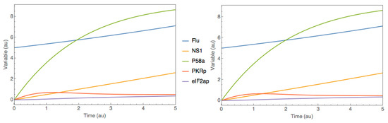 The second case study was based on the viral infection model proposed by Goodman et al. [39], freely available in SBML in the JWS Online database (http://www.jjj.bio.vu.nl, accessed on 31 January 2023) under accession ID ‘goodman’ (Table 1). The authors studied the dynamics of the P58IPK signal transduction pathway during Influenza virus infection. A mathematical model was developed to evaluate the effect of protein P58a activation on the P58IPK pathway dynamics, particularly on the activation of the PKR kinase and on the phosphorylation of eIF2, both controlling viral protein expression. The model comprehends nine species (Flu, NS1, P58a, P58total, PKRp, PKRtotal, eIF2ap, eIF2atotal and ext) in a single compartment, of which four are fixed (P48total, PKRtotal, eIF2atotal and ext), corresponding to five ODEs. The model further has nine reactions and 10 parameters. The names of variables were kept the same as in the original model and are explained in the database.