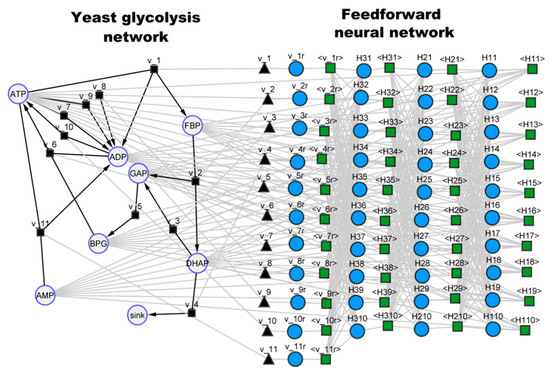 Hybrid model structure [7 × 10 × 10 × 10 × 11] for the yeast glycolysis pathway (6th row of Table 3) visualized in the cy3sbml tool [43]. Left side: Reduced glycolysis network with physical meaning. Large circles represent biochemical species (metabolites). Black squares and black edges represent biochemical reactions. Black triangles represent kinetic laws. Right side: Artificial feedforward neural network with size [7 × 10 × 10 × 10 × 11]. Small blue circles represent neural network nodes. Green squares and gray edges represent signal propagation between neural network nodes. The first layer receives input signals of biochemical species concentrations (Large circles). The last layer delivers kinetic parameter values to the black triangles, which mediate the communication between both sides of the network.