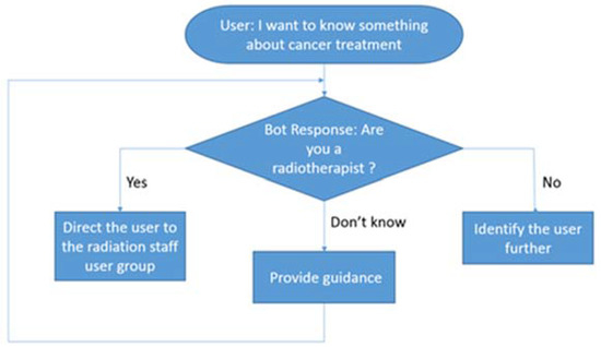 First, the scope of the project has to be defined by identifying the types of potential users and their needs. Such information can be gathered through workshops, meetings and conferences. In radiotherapy, the user groups may include the radiation staff working in the cancer centre, cancer patients, and people from the general public including the patient’s family members. After understanding their needs, a chatbot can be created to address the issues. The chatbot is designed to simulate conversation with different kinds of human users through the internet. Figure 1 shows an example of the basic workflow of the chatbot. In Figure 1, the chatbot begins with questions identifying the user. The user may be a radiation staff member such as a radiotherapist or medical physicist looking for specific radiation treatment information in their fields (e.g., radiation safety), or a patient or his/her family member looking for general information about a specific radiation treatment process (e.g., external beam radiotherapy). Both groups of users have their specific needs. For example, radiation staff may want to confirm some specific rules and policies in radiation safety [26], while patients may want to understand some basic terms in external beam radiotherapy [27]. Therefore, it is necessary to classify and direct the user into his or her groups linked to the related database.