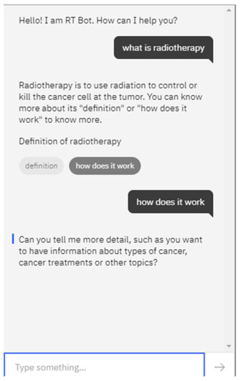 In Phase 1, for example, the interaction logic of the chatbot starts with a brief introduction and asks what it can help the user with (e.g., Figure 3: “Hello! I am RT Bot. How can I help you?”). The chatbot can answer most direct questions regarding radiotherapy such as “What is radiotherapy?” typed in by the user as shown in Figure 3. After answering, the chatbot follows if the user wants to know the definition of radiotherapy or how it works. However, if the chatbot does not understand the user’s text, a systematic guidance will be provided to the user as a structured Q and A set.