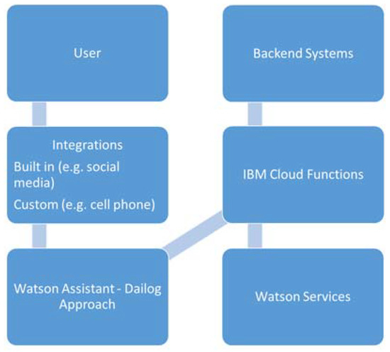 The architectural diagram of the chatbot created on the IBM Watson Assistant platform can be seen in Figure 4. The chatbot is created by the Watson Assistant and can be integrated into social media or customized IoTs such as cell phones. The Watson Assistant provides AI features such as NLP and is linked to the IBM Cloud. The Cloud is further connected to other Watson services such as speech to text conversation and the backend systems.