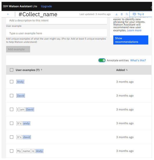 It should be noted that some intents require less than a few examples as the chatbot expects the user to answer only “Yes” or “No”, as there are limited ways to write them. However, in some specific cases such as name collection when the chatbot asks the name of the user, the Intent works alongside Entities using the “Annotate Entities” function as shown in Figure 6. When the chatbot collects the user’s name, the only part of the input that the chatbot is interested in is the name itself but it is not interested in other words. Therefore, the function of the “Annotate Entities” is to select the region of interest in the example sentences (i.e., the blue boxes in Figure 6). In this way, the chatbot may categorize any future names as entities, even the ones that it has not seen before. For the tool of Entities, the function can be considered a database that the chatbot has access to, can cross-reference and extract data. For example, a list of 6000 most common names in America can be used as a database [8]. The chatbot can extract names, when recognizing the related “#Collect_name” intent as shown in Figure 6.