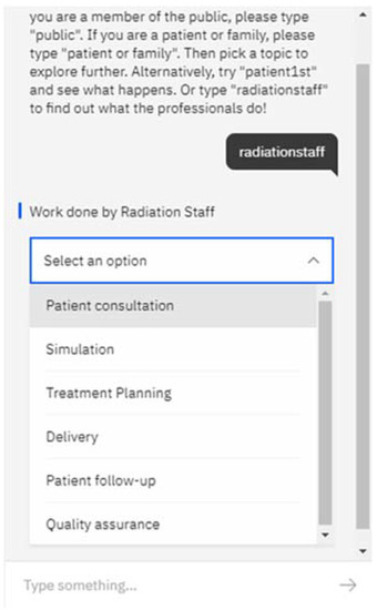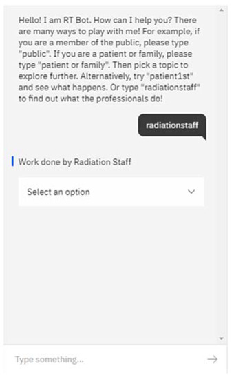 The chatbot introduced himself and tried to identify the user and whether he or she belonged to the group of radiation staff, general public or patient’s family.