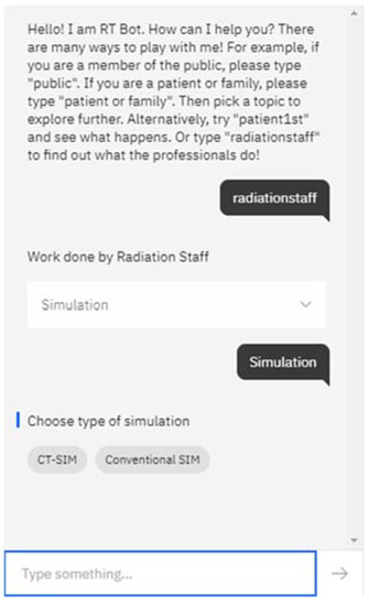 The contents of the list included different categories of information such as patient consultation, simulation, treatment planning, treatment delivery, patient follow-up, quality assurance and so on. This list was designed specifically for the radiation staff. For patients and the general public, they had their own list of information. When the user (radiation staff) selected “Simulation” from the list, the chatbot further asked the user to clarify if he or she was interested in “CT-SIM” or “Conventional SIM”. These are two common treatment simulation methods in radiotherapy. To answer that, the user only needed to click the icons to obtain the information as shown in Figure 9.