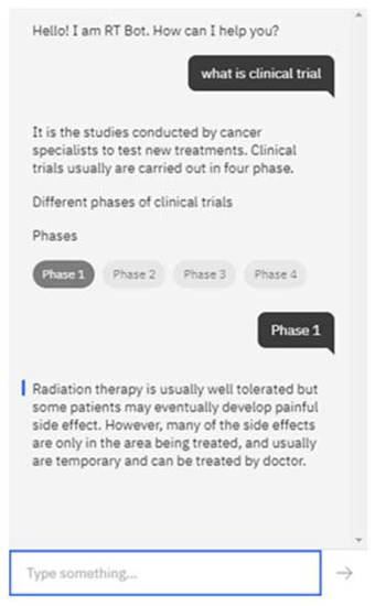 Sometimes, the user may ask the chatbot a question directly. For example, the user asked the chatbot “What is clinical trial?” in radiotherapy as shown in Figure 11. In that case, the chatbot answered the question and asked the user if he or she wanted to know more, such as different phases of clinical trial. The user could then select a phase (Phase 1–4) from the chatbot. In Figure 11, the user picked up Phase 1. The chatbot would then explain further the Phase 1 trial in greater details.