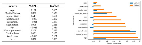 The detailed results of the feature importance plot and feature importance ranks for GA2Ms and MAPLE methods on the adult are tabulated and shown graphically in Figure 3. By comparing the results from MAPLE and GA2Ms methods, we see that “age” and “capital_gain” have high contributions to the prediction. Some features such as "marital_status” in MAPLE have low contributions while in GA2Ms they highly contribute to the prediction which, again, illustrates the Rashomon effect, i.e., different feature weights can be provided as explanations.