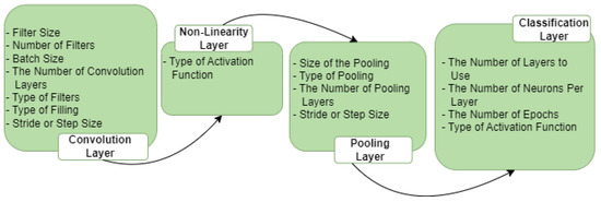 CNNs are frequently used in applications where artificial vision techniques are required. Even though the results are extremely encouraging, they come at a high computational cost; for this reason, it is critical to use strategies that boost performance. Optimization of the CNN parameters is presented in this study in order to improve the recognition rate and reduce computational costs. In Figure 3, we can see a few parameters for each CNN layer that require optimization.