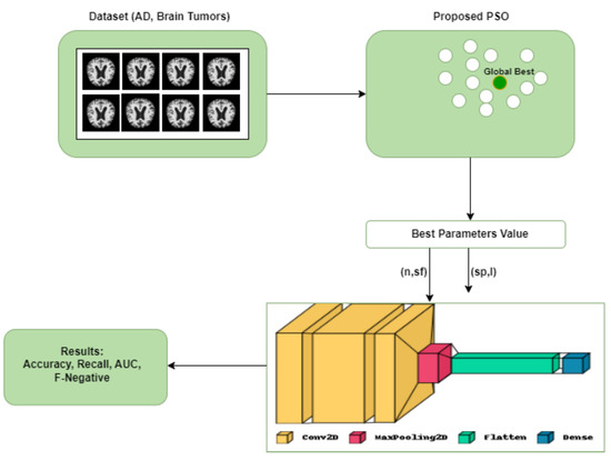 Based on the effective performance of DNN and CNN methods in various image classification tasks [8,10], the study goal is to help design a more efficient system for making a highly accurate prediction for AD and brain tumor diseases using a highly efficient optimization algorithm known as Particle Swarm Optimization (PSO). Our main contributions can be recapped as follows: