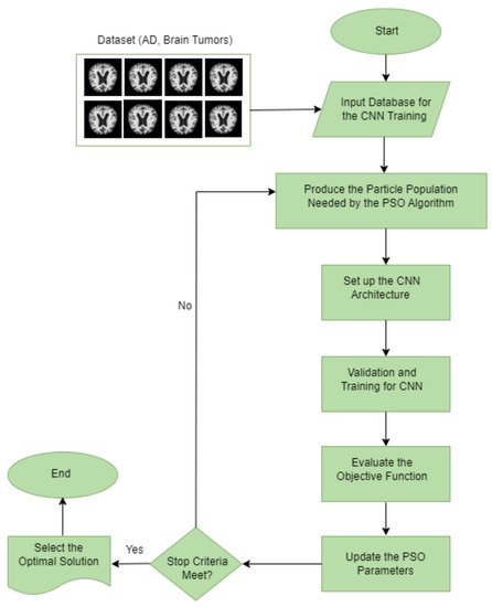 The remainder of this paper is structured as follows: Section 2 provides related studies of AD and brain tumor diagnosis and classification. The proposed CNN-PSO model is built and evaluated in Section 3, which also presents the methodology. Section 4 presents the experimental and evaluation results; Section 5 concludes the paper and discusses future works.