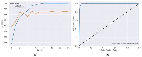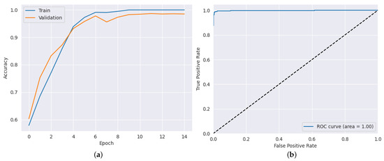 Results for tumor dataset: (a) training and validation accuracy results (b) AUC result.