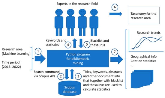 Figure 1 shows our process for bibliometric mining. First, the research area (machine learning) and time period (2013–2022) were sent to the program for bibliometric mining (Step 1 in Figure 1).