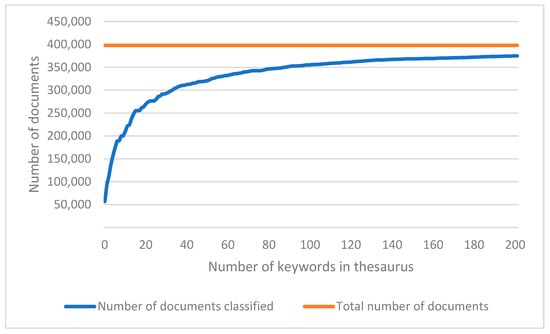 In Figure 2, the keywords in the expert-defined blacklist are removed, and the remaining keywords are ordered according to the number of documents that have the keyword in either the title, abstract, or author-defined list of keywords, with the most frequent keywords being first. The blue line in Figure 2 indicates the number of documents that have been classified as belonging to at least one research direction as a function of the number of keywords considered. The figure shows that for 200 (out of 383,559) keywords, more than 94% of the documents have already been classified as belonging to at least one research direction. The expert-defined thesaurus used in this study contained 202 keywords (see Appendix B).