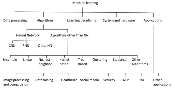 Figure 3 shows the expert-defined taxonomy used in this study. As can be seen in the figure, there are 22 leaf nodes, four internal nodes (Algorithms, Neural Network, Algorithms other than NN, and Applications), and one top node (Machine learning). Section 4.2 covers the different levels in the taxonomy.