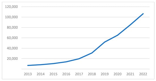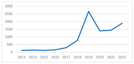 Total number of documents per year in ML for the period of 2013 to 2022.