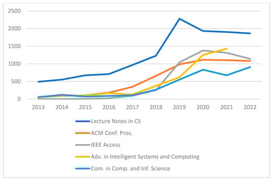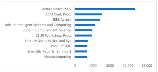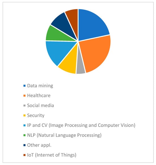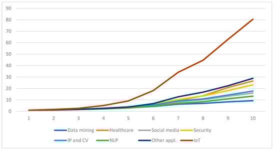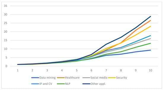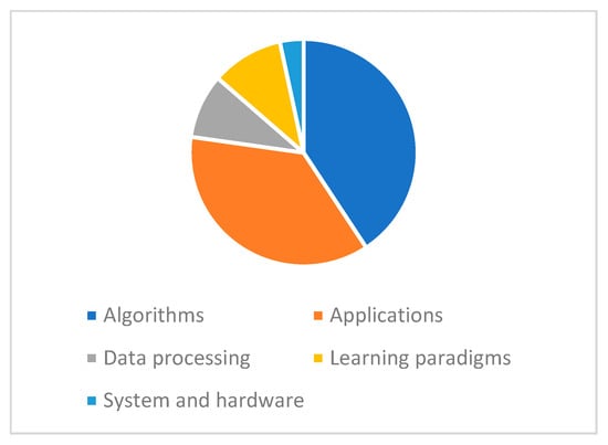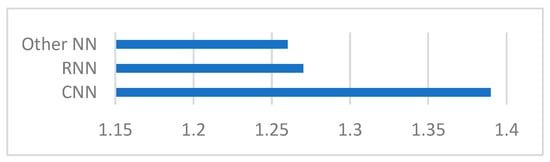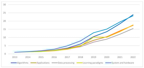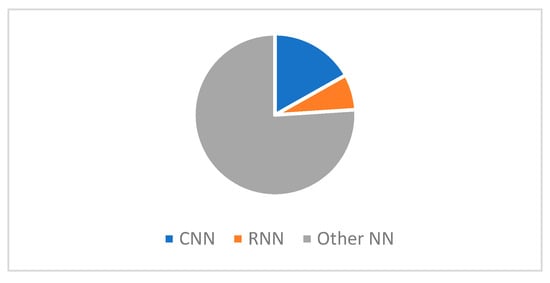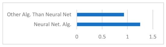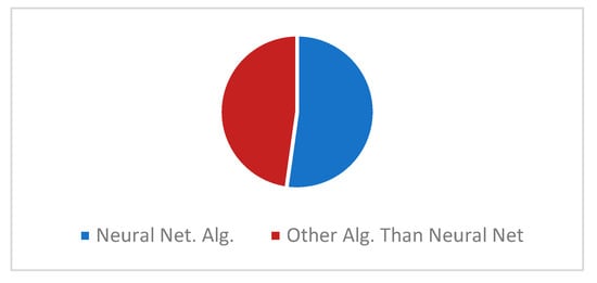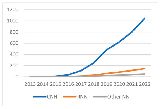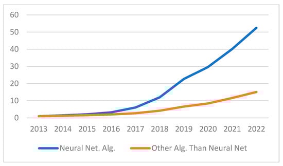 As can be seen in the taxonomy in Figure 3, the research direction Algorithms was divided into two categories: Neural Networks and Algorithms other than NN or Other Algorithms Than Neural Networks. Figure 9 shows that these two categories contain almost the same number of documents (Neural Networks is slightly larger). Figure 10 shows that the category Neural Network is growing significantly faster than the other category.