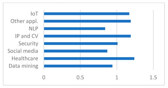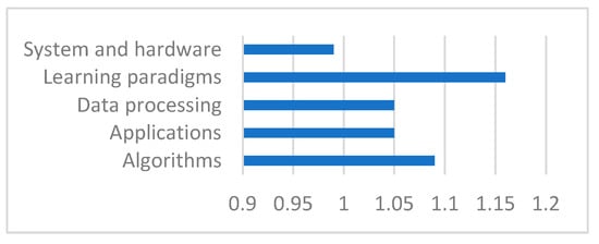 Figure 8 shows the average NCS for the five top-level research directions in ML from 2013 to 2022. The figure shows that documents in the research direction Learning paradigms are the most cited ones (NCS = 1.16) and that documents in the research direction System and hardware have the lowest number of citations (NCS = 0.99). One can see that the average of the four NCS values shown in Figure 8 is more than 1. By definition, the average NCS for all documents was 1. However, as mentioned previously, some documents may belong to many research directions, and some other documents may not belong to any research direction. Since the average of the NCS values in Figure 8 is larger than 1, it seems that documents with many citations tend to belong to many research directions.