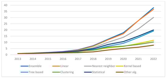 The taxonomy in Figure 3 shows that the research direction Other Algorithms Than Neural Networks can be split into eight categories: Ensemble methods, Linear methods, Nearest Neighbor methods, Kernel-based methods, Tree-based methods, Clustering, Statistical methods, and Other algorithms. Figure 15 shows that the categories Ensemble methods and Kernel-based methods contain the largest number of documents for the time period considered. Figure 16 shows that the categories Ensemble methods and Linear methods are the categories within the research direction Other Algorithms Than Neural Networks that grow the fastest.