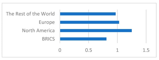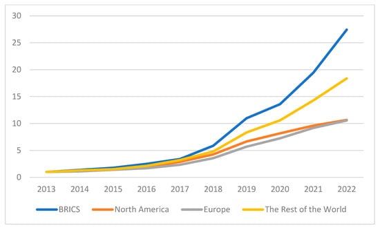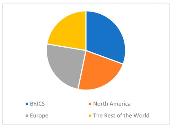 We considered four geographic regions: Europe, North America (USA and Canada), the BRICS countries (Brazil, Russia, India, China, and South Africa), and The Rest of the World. A document with authors from more than one geographic region was counted proportionally in the corresponding regions, e.g., a document with three authors—one from China, one from Sweden, and one from Argentina—was allocated 1/3 to the region BRICS, 1/3 to the region Europe, and 1/3 to the region The Rest of the World. A small fraction (less than 3%) of the documents did not have information about affiliation country. These documents were excluded from this part of the study.