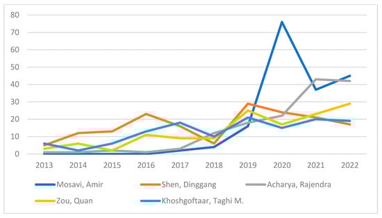 We identified the 10 most productive authors in our dataset during the time period of 2013 to 2022. For the five most productive authors we plotted the number of documents per year. We also identified the 10 document sources that contributed the most to our dataset during the time period of 2013 to 2022. For the five most important sources, we plotted the number of documents per year.