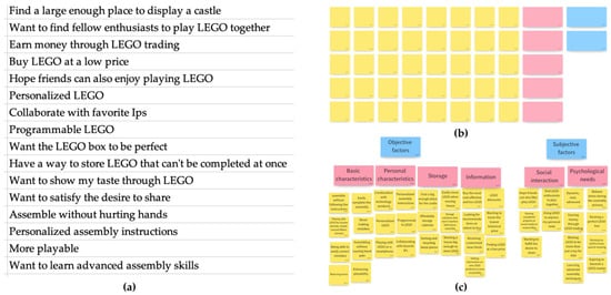 The operation of the affinity diagram method. (a) The user needs data prepared in advance. (b) Online whiteboard tool Boardmix prepared in advance. (c) The completed affinity diagram.