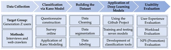 The workflow shown in Figure 2 delineates the steps of our research methodology, including data collection, classification via the Kano Model, building the dataset, the application of deep learning models, and usability evaluation. In the relevant section, each step meticulously details the tools and methods employed, ensuring the transparency and reproducibility of the research. The purpose of this flowchart is to provide a clear visual guide for readers, aiding in the comprehension of the entire research process.