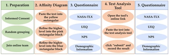 In this study, a single-factor, two-level, within-subjects design was utilized to evaluate and compare the performance of the text classification tool developed in previous stages with the conventional user needs classification method—the affinity diagram. The usability test procedure is presented in Figure 3. The sequencing of the second (affinity diagram) and fourth steps (text analysis tool) may vary across groups to counterbalance potential order effects.