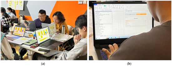 Actual experimental photographs. (a) Participants completing classification tasks in groups using an online whiteboard tool (Boardmix) for the affinity diagram; (b) participants completing the classification task individually using the text analysis tool.